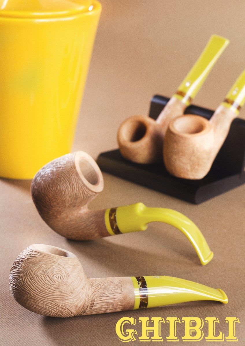 Ghibli, il nome del vento che soffia nel deserto per questa pipa senza imperfezioni, con una lavorazione che ricorda i segni della sabbia del deserto mossa dal vento. Bocchino in metacrilato colore senape e vera marmorea sui co...