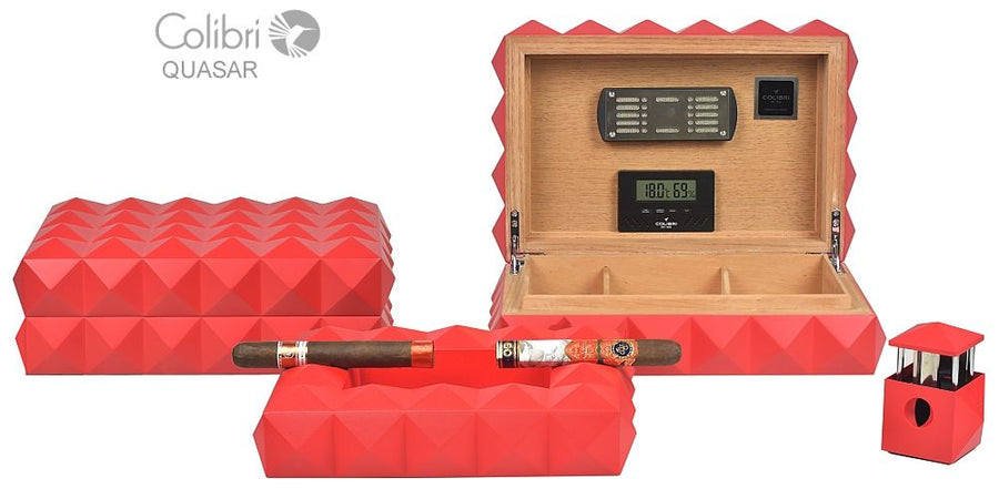 Il nostro esclusivo Set Colibrì Quasar rosso è un'opera d'arte imperdibile, la cui sofisticata bellezza e lusso esalta il tuo status. Dotato di humidor di alta qualità e di un posacenere e un tagliasigari, rende memorabile ogni gioco di fumo. Un prezioso pezzo per il tuo arredamento.
